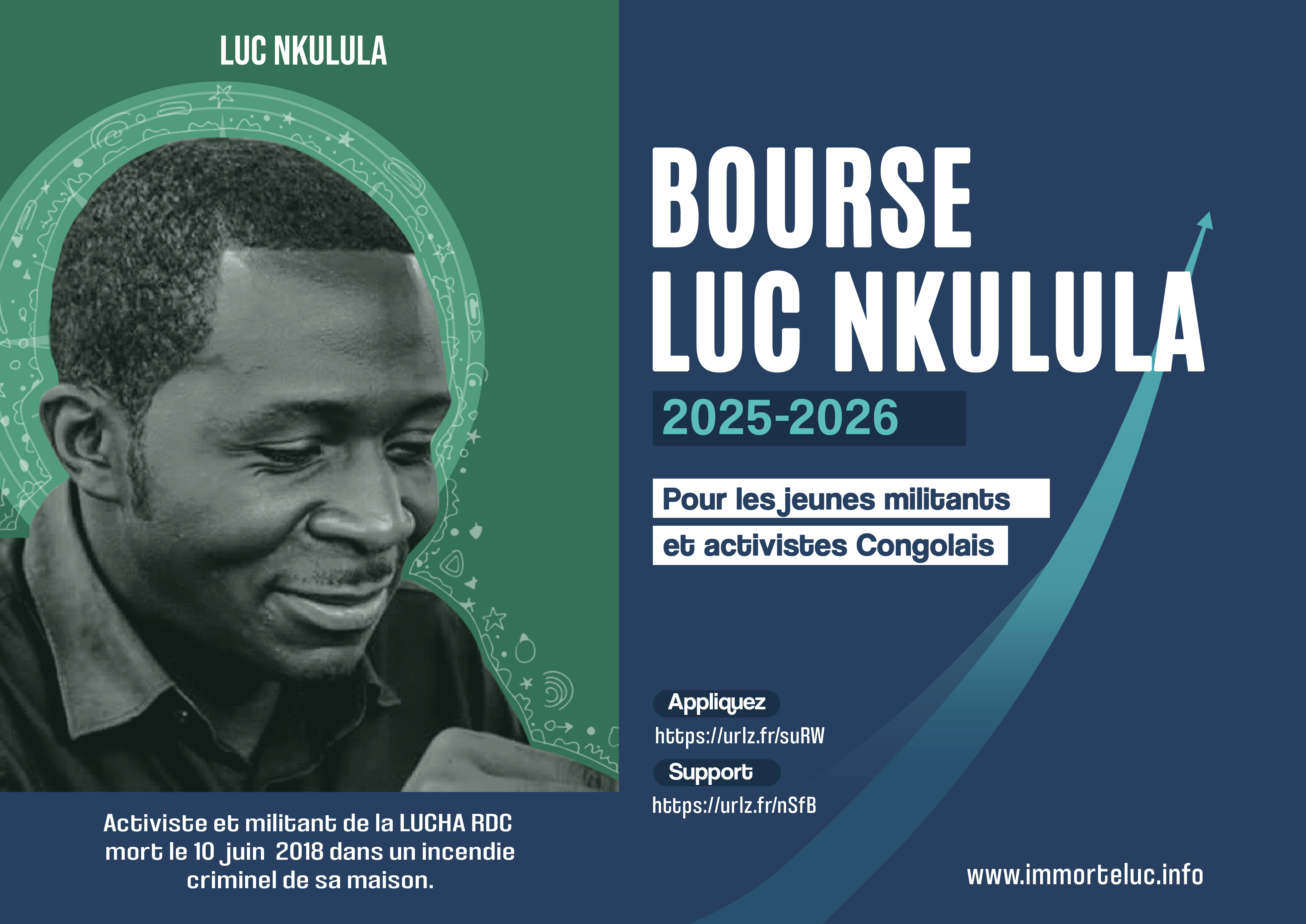 Créée en 2022, la bourse Luc Nkulula est une initiative portée par des amis et camarades de Luc et de LUCHA pour rendre hommage à Luc Nkulula, activiste congolais tué à Goma le 10 juin 2018 dans l’incendie de sa maison en raison de son engagement pour le Congo. Cette initiative vise également à promouvoir l’excellence et la générosité qui caractérisait Luc Nkulula de son vivant. Vous pouvez la rejoindre en tant que candidat en postulant à cet appel à candidature ou en tant contributeur en intégrant le comité de la bourse via ce formulaire d’enregistrement.